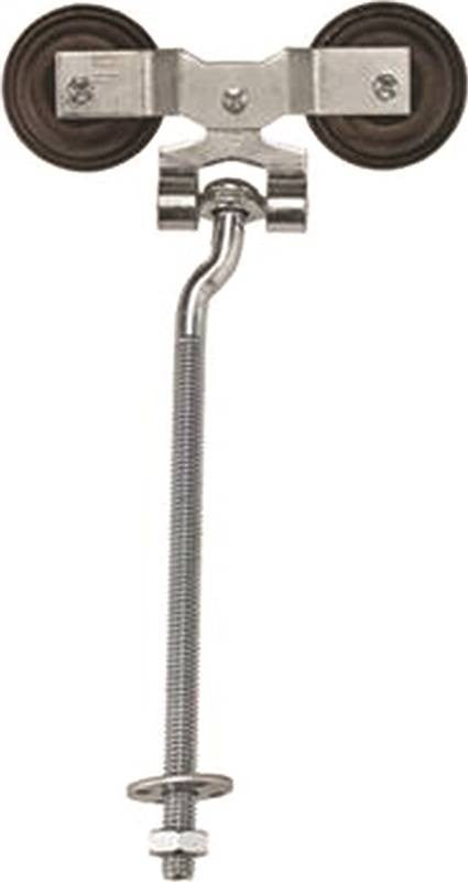 Designed for use with round rail on wood-frame, metal-clad doors using a 2"x6" top lateral. 1/2e offset 9" bolt (with 7" thread) adjusts door vertically and laterally (1") from inside building. Flexible trunnion design resists door damage. Precision-ground and hardened steel roller bearings, axles and sleeves provide longer life and easier operation. Interchangeable with other brands of round rail. Safe Working Load - 300 lb. per hanger.