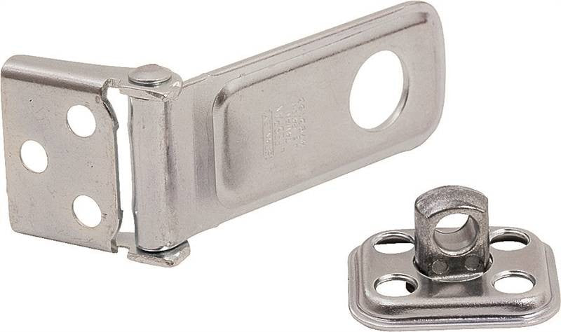 Rotating post allows padlock to hang straight whether hasp is mounted in horizontal or vertical position. Rotation also helps prevent forced entry by twisting off post with steel rod or pry bar. Corrugated leaf. Leaf's hold open feature eliminates unwanted swinging to limit possible damage to door and frame. Exclusive full-width knuckle design and supporting side walls reduce sag. All component parts are plated prior to assembly to enhance rust resistance.
