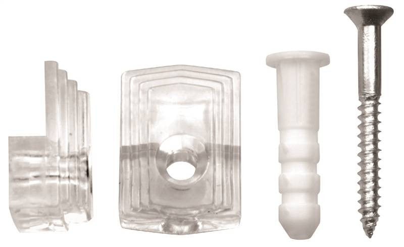 Attaches mirrors to doors and walls. Attractive design and is easy to use. Mirror Holders come with Hardware and holds mirrors up to 20 lbs. Includes: 4 OOK clear mirror clips, 4 screws, 4 anchors