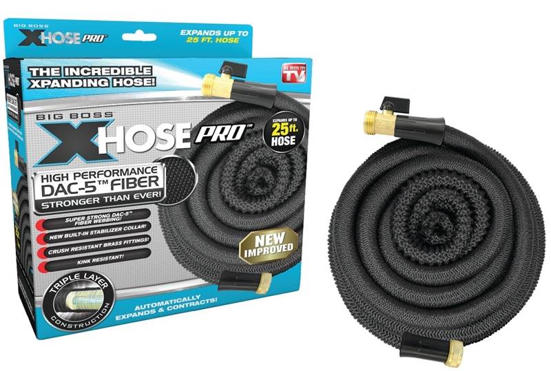Automatically expands up to 3 times its length while giving you a wide diameter of powerful high-flow spray. Simply turn the water on and watch the XHose grow. Turn the water off and the XHose contracts back to a short length. No more struggling with heavy hoses. Light and kink-free design that weighs about 1 lb. is made from a super strong, tough, expandable inner hose and a folded outer hose made from super strong webbing.