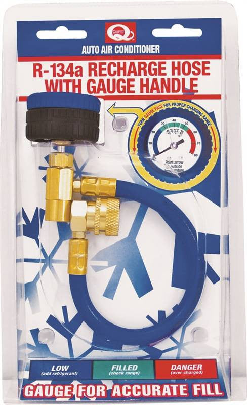 Reusable, with a low pressure gauge built into the handle and a dial pressure indicator to help charge to the correct fill level. It charges R-134a into the low-pressure service port using a 90 degree quick-couple fitting for tight spots around the low pressure service port. All metal construction. On a card. Unable to Sell in: CA