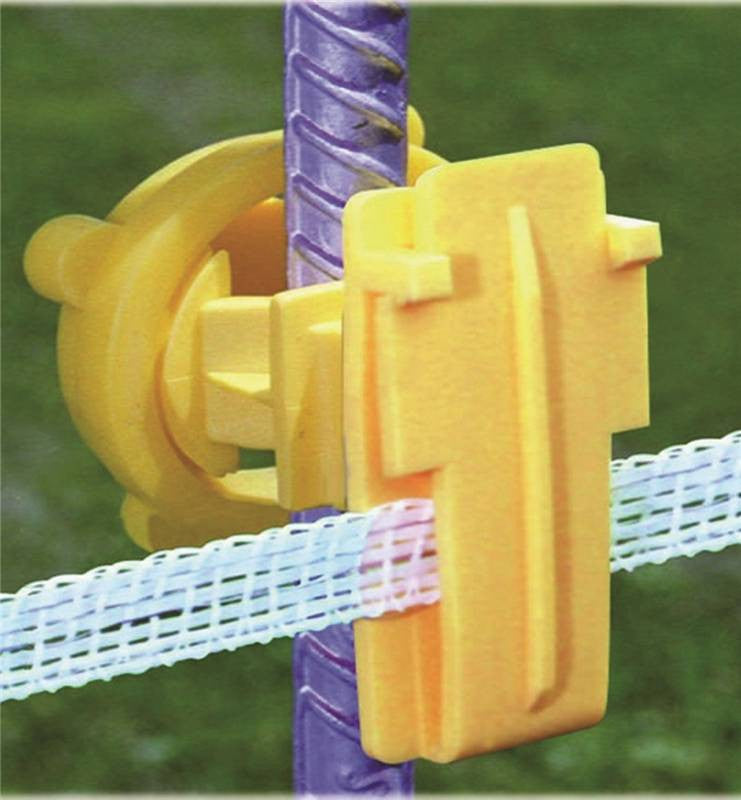 Designed specifically for poly tape electric fence wire. Will accommodate all sizes of tape to 2" width. Easy poly tape insertion with snap shut. Latches securely but quickly opens to take down and move poly tape. Tape will float in all directions but cannot come out. No moving parts or latches to insert or break. Self centering post cavity with spin-on nut. Fits all posts 1/4" to 9/16".