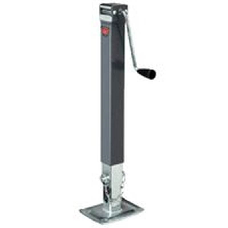 Drop leg with heavy-duty base. 2.53 square tubing. Drop leg offers 13.50" additional adjustment. 1/4" cross pin connects gear train to screw stem to prevent shearing jack pin. 5/8" screw stem to prevent screw stem twisting off. Crank included.