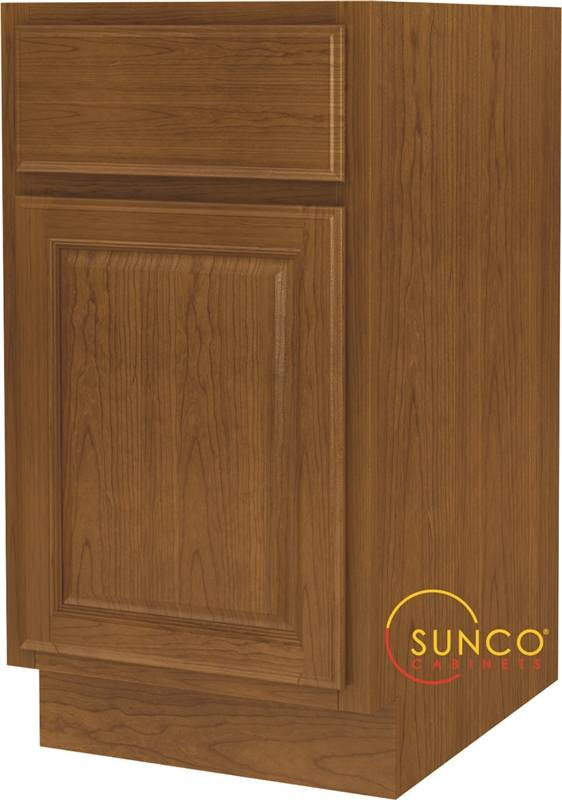 Cam-Lock joinery system for easy assembly. All wood box construction with real wood veneer finish on all plywood box. Fully enclosed interior compartment with full 1/2" framed back panel. Natural interior cabinet finish, raised panel door, 1/2" traditional overlay, Amber door finish. 1/2" plywood drawer box. 34-1/2"h x 24"d.
