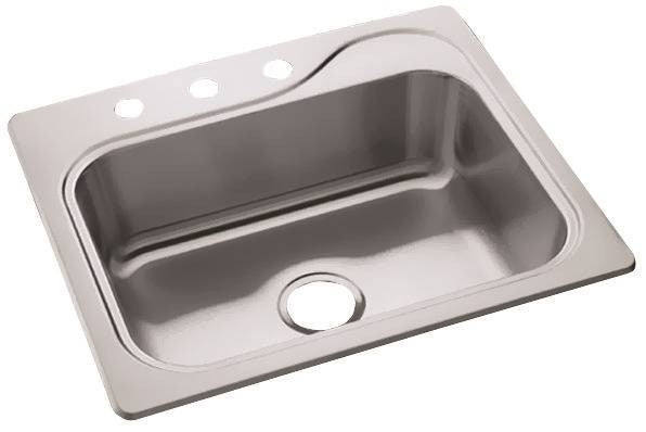 1-7/16" diameter faucet punching, 4" centers on 3 main holes, 5-1/8" center to sink edge for 4th hole. 3-5/8" diameter centered drain hole in basin. Made from single sheet of stainless steel with continuous weld stainless steel channels for a smooth, attractive surface. SilentShield sound-deadened bowls to reduce noise and vibration. Rolled outer rim and pre-assembled clips for easy installation. Includes installation hardware. Meets or exceeds IAPMO/UPC. Cut out: 24-1/4" x 21-1/4" with 1/2" radius corners; 21" x 15-1/4" x 7''D basin.