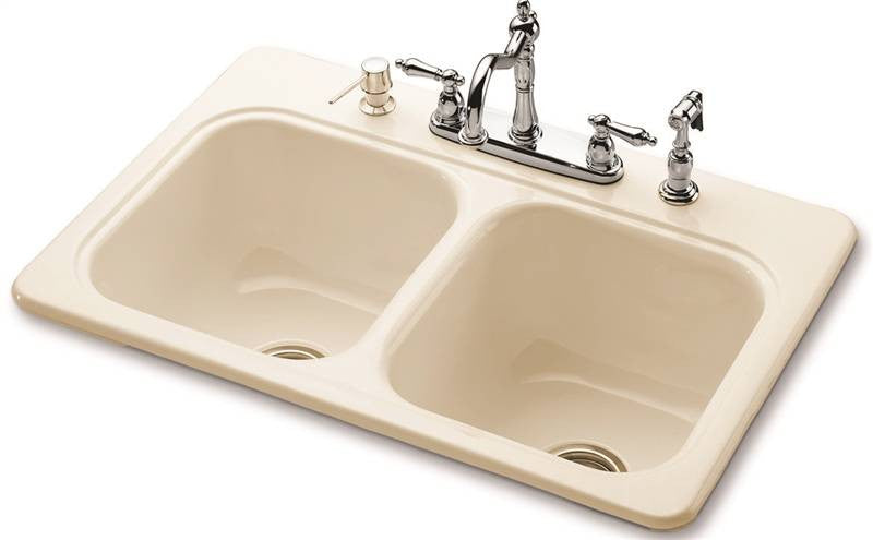 4 hole punch, self-rimming double bowl kitchen sink has two full-size double bowl compartments. The flat mounting surface accommodates the latest faucet designs. The 1-1/2" rim radius makes the countertop cut-out an easy retro fit applications. Faucets not included. Complies with: ANSI A112.19.4M, WW-P-541, HUD-FHA-VA.