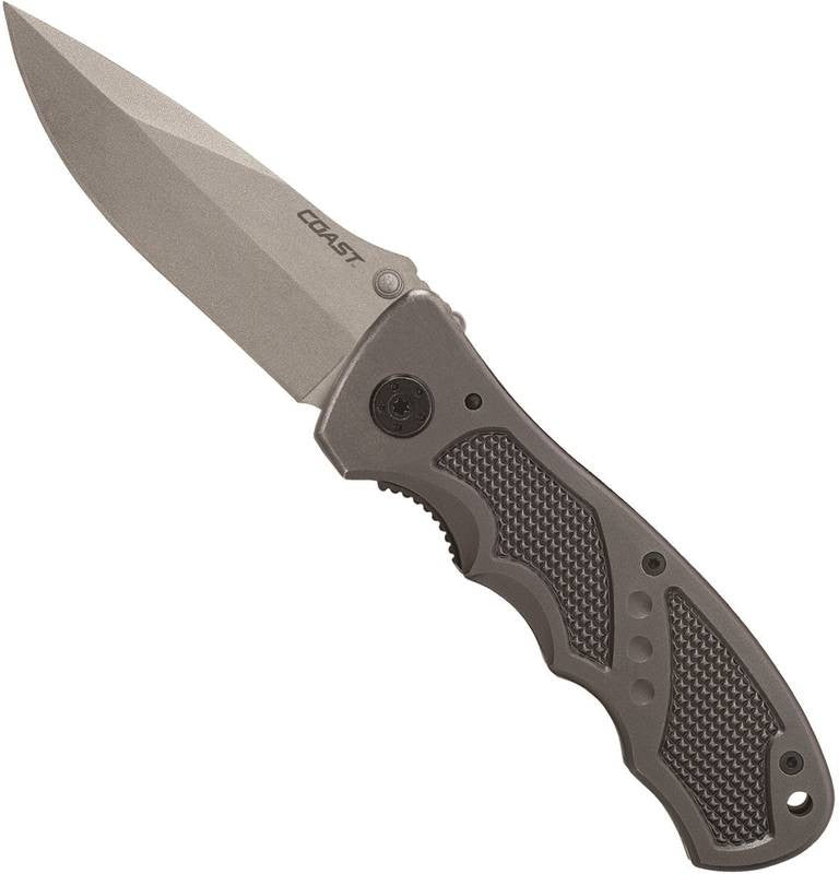 Stainless steel 3.9" blade. Liner-lock knife with checkered design dark gray finish aluminum handle. Stainless steel drop point blade with dual thumb studs. Lanyard hole. Black finish stainless pocket clip. Double lock blade locking system for added safety.