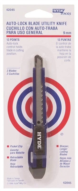 13 Sharp points per blade. Retractable blade with one piece positive lock; stainless steel blade track; built-in blade breaker; includes: 3 blades (2 blades stored in handle). Blue high impact polystyrene. Applications: cut cardboard, foil, paper and wallcovering.