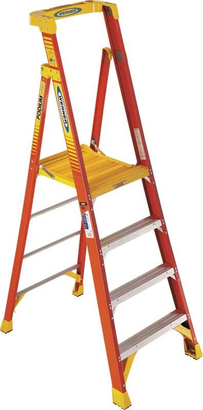 Extra-large platform for long standing comfort. Locktop extended guard rail securely wraps around work zone and holds tools. Edge 360 includes an integrated rail shield, Edge bracing and oversized foot pads. Double riveted slip-resistant Traction-Tred steps. Back-up plates reinfoce all top connectors. All steps and two rear horizontals are knee-braced