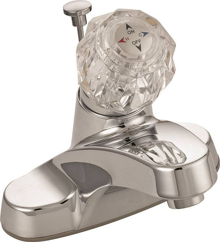 4"centers. Single acrylic round handle, durable metal construction, solid brass waterways, 1/2" NPSM inlet. IAMOP & NSF certified. Carded.