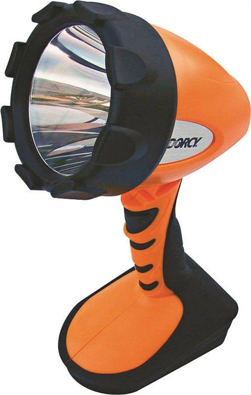 Spotlight head rotates vertically up to a 90 degree angle. Light can be adjusted from a 45 degree angle while holding the light to a 90 degree angle. The flat base allows the spotlight to stand for hands-free use. Made of rubber /plastic. 500 lumens, 587 meters. 5.5 continuous hours. 11.06" L x 6.410" W, 2 lb. with batteries. Locking trigger.