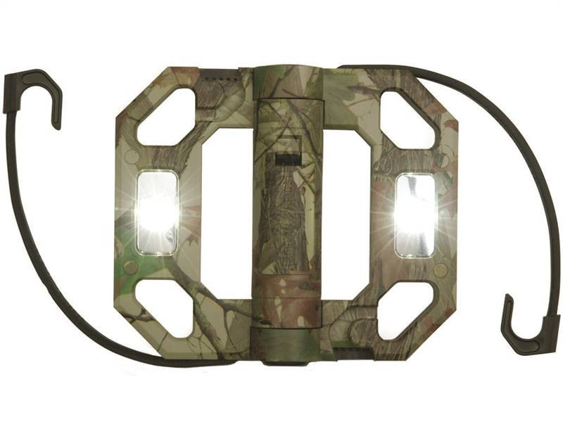 Compact folding LED work light with bungee hooks. 2 high powered LEDs generate up to 180 lumens. 3-way integrated switch: both panels on/single panel on and off. Hinge adjusts up to 270 degrees. Durable polycarbonate lenses. Bungee hooking mechanism attaches to hard to hang places. Extendable bungee hooks stow inside each panel for easy storage. Up to 4.5 hour battery life with 3 AA alkaline batteries, included.