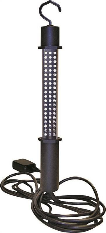 Instant on switch. Durable plastic construction with polycarbonate lens. Cushioned grip. Swivel hook rotates 360 degrees. 15', 18 gauge cord. 120 volts.