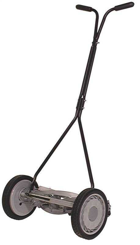 4 spider 5 blade, ball bearing reel. Tempered alloy steel reel and bed knife blade. Unbreakable steel side plate 1'' welded torsion tube frame assembly. Cutting height 1/2'' to 2-1/4'' with adjustable 4-section roller. Wheel height adjustable in 3 positions. Chrome plated handle with flared type design. Cushioned handle grip. 16'' cutting width. 10'' durable composite wheels with radial tread tires. 2-3/4'' Molded hub caps.