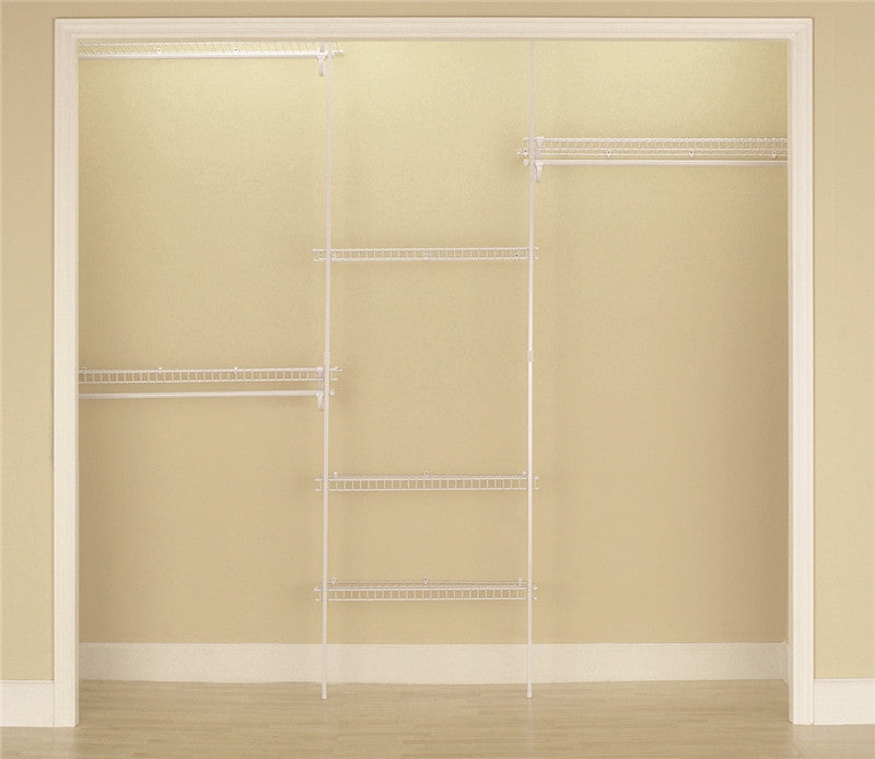Utilizes "SuperSlide" shelving to provide a continuous hanger slide. For 5' to 8' closets. All hardware included. Sturdy steel construction. Size: 9' hanging space and 12' shelf space.