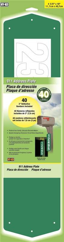 Predrilled, non-reflective heavy-duty plate can be attached for horizontal or vertical applications. Address plate and house numbers combine to improve visibility. A supply of (40) 3e reflective numbers are included. Attach to mailbox post, fence or tree. Assists emergency personnel, fire and police departments by easily identifying address at night or in low visibility.