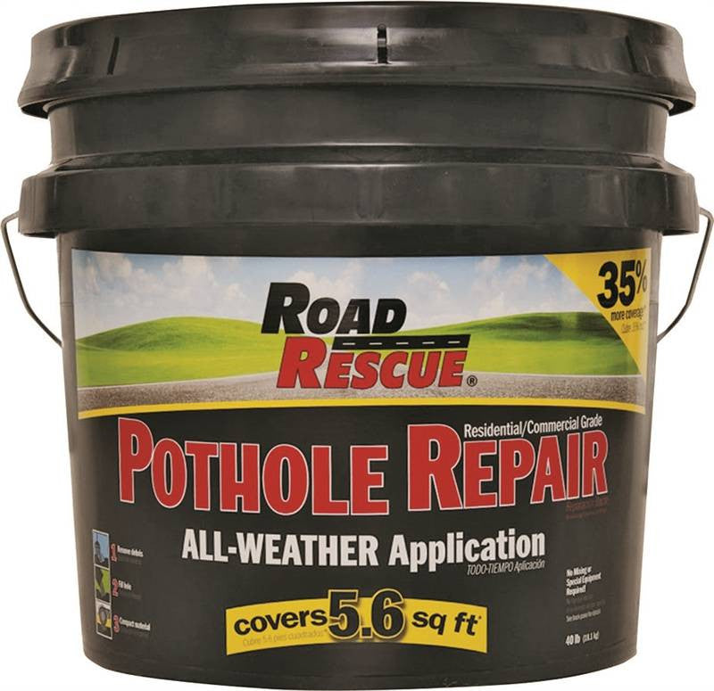 Used to repair and patch potholes and cracks over 1" wide in blacktop, asphalt and concrete roads, driveways, parking lots, manholes, water valves, drains and edge repairs. Contractor grade and hardens immediately upon compaction without tracking. Product will not solidify in bucket. No heating or mixing. One minute application. Ready for traffic immediately. Works in any weather; hot or cold, wet or dry and requires no special tools for application. Covers 5.6 sq. ft. at a depth of 1". Zero VOCs.