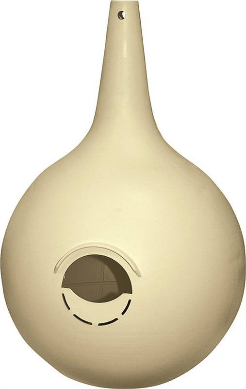 Non-translucent almond color gourd reduces heat build-up in the summer and has a longer life than natural gourds. 2-piece gourd design makes cleaning easier. Gourd has a molded rain drip guard that sheds water around the entrance hole while not detracting from the appearance of a natural gourd. Drainage slots in bottom helps prevent water build-up. The two halves snap together and are secured by a single screw. Starling deterrent is provided.