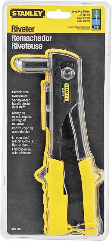 Right angle riveter sets 1/8", 5/32" and 3/16" diameter rivets. Spring loaded handle ejects rivet stem automatically, slim nose design fits in tight hard to reach places.