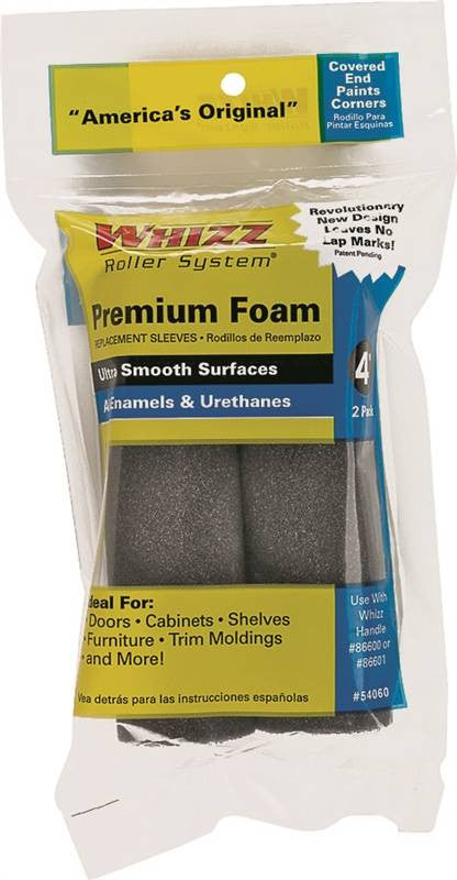 For varnishes, polyurethanes, oil enamels. Works on all whizz handles for 4" and 6". Covered end paints corners. Patent pending-concave ends. Easy clean-up. No lap marks. 55 Kilo high density black foam