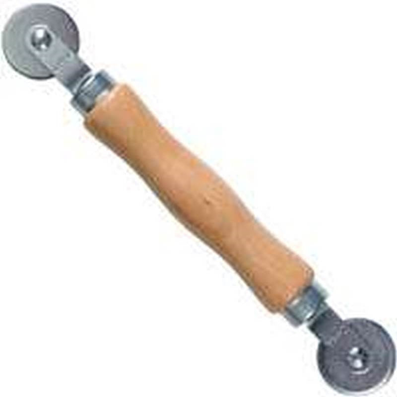 Wood handle with metal convex and concave rollers for screen spline and drop-in glazing. Used to replace broken screens in windows and doors, or to replace broken glass in windows and doors with aluminum frames. Instructions printed on each package.