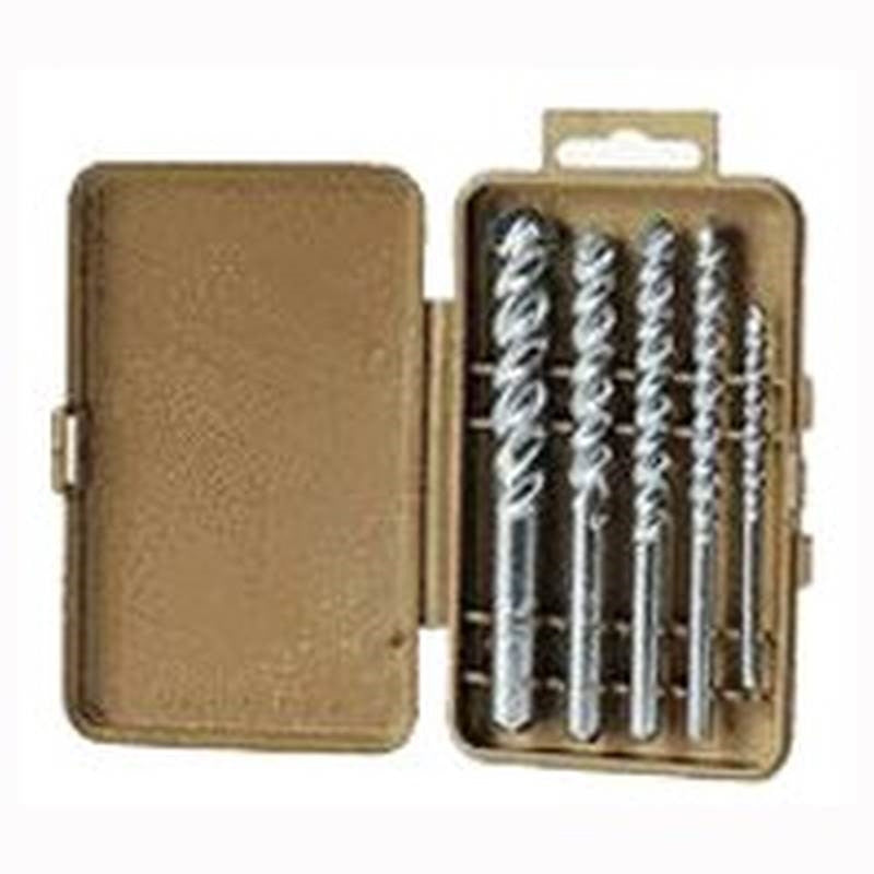 High speed steel drill bits used in masonry applications. Includes (1) one each: 3 /16", 1/4", 5 /16", 3/ 8", 1/2", and molded plastic case.