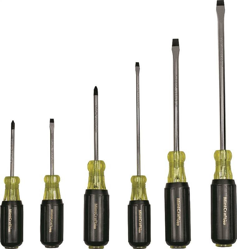 Chrome vanadium steel blade ensures greater hardness, strength, and durability. Satin chrome plated blade with magnetic tip. Soft rubber grip provides greater comfort and control. Includes sizes: Slotted: 3/16" x 3", 3/16" x 6", 5/16" x 6", 3/8" x 8". Phillips: #1 x 3", and #2 x 4".