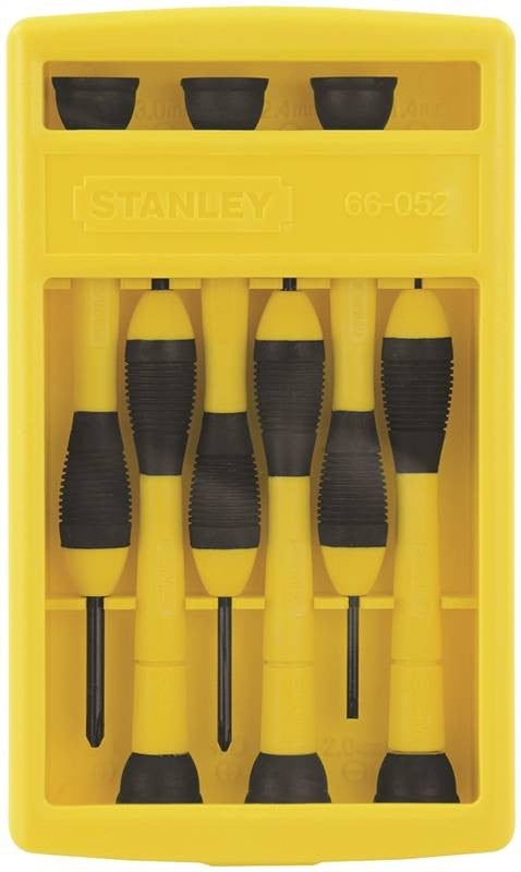 Provides 6 popular Phillips and slotted screwdrivers for a wide range of fastening applications. Swivel head handles provide precision and reach. Tough plastic shafts with soft cushion grips. Includes: 0-point and 1-point Phillips, and 1.4-mm, 2.0-mm, 2.4-mm and 3.0-mm slotted screwdrivers and plastic storage case. Carded.