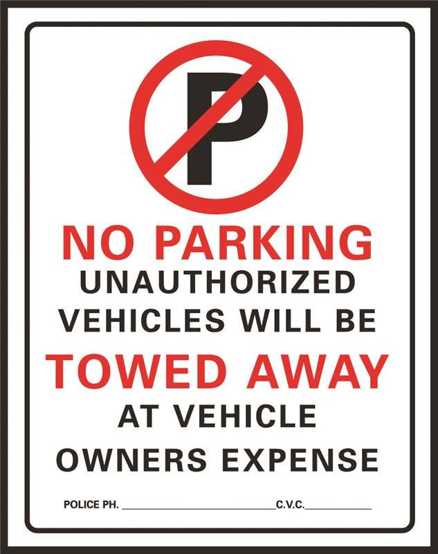 Red and black letters on white background. Sign states "NO PARKING UNAUTHORIZED VEHICLES WILL BE TOWED AWAY AT VEHICLE OWNERS EXPENSE".