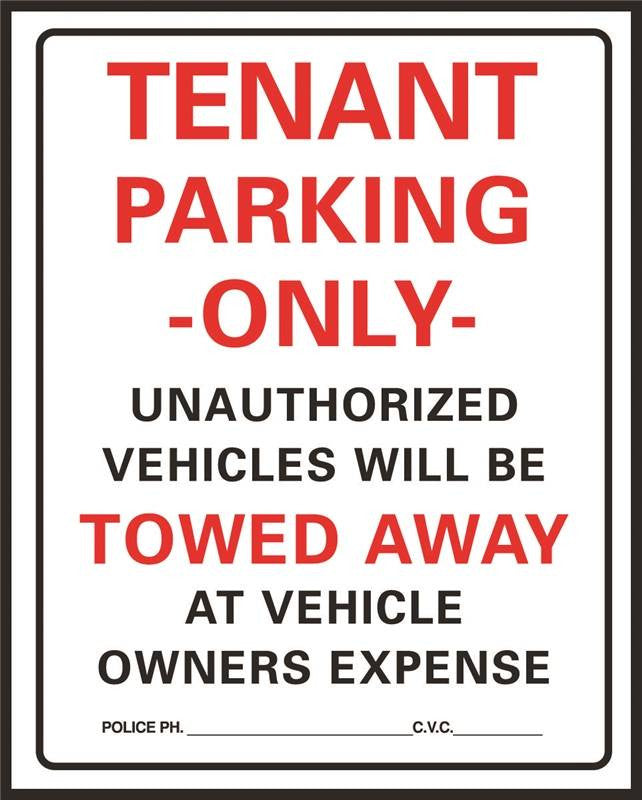 Red and black letters on white background. Sign states "TENANT PARKING ONLY UNAUTHORIZED VEHICLES WILL BE TOWED AWAY AT VEHICLE OWNERS EXPENSE".