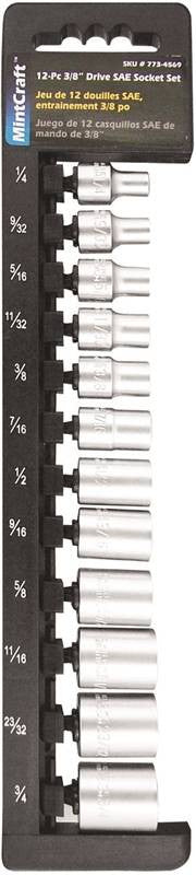 3/8" drive, 6 PT drop forged chrome vanadium steel socket. Size: 1/4", 9/32", 5/16", 11/32", 3/8", 7/16", 1/2", 9/16", 5/8", 11/16", 23/32", 3/4".