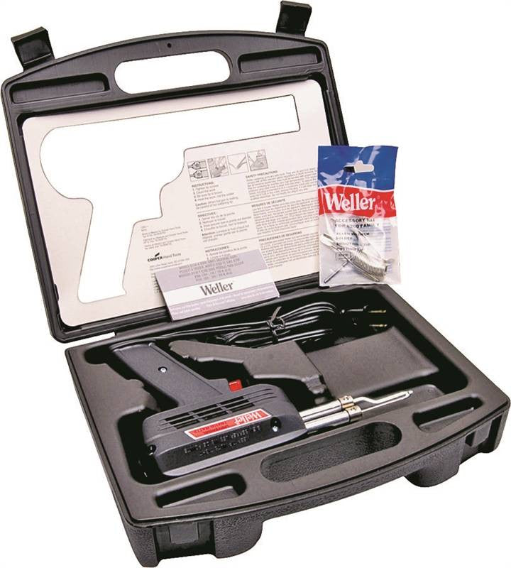 All purpose gun, 120 volts; dual-heat gun produces 140 or 100 watts with pisto, grip design; fingertip trigger selects high (1st trigger position) or low output (2nd trigger position); ready to use in 6 seconds; high efficiency, tin-plated copper tip; light illuminates work; contains 8200 soldering gun, (1) soldering tip, (1) smoothing tip, (1) cutting tip; alson contains a coil of lead free solder; instructions included; UL and cUL listed.