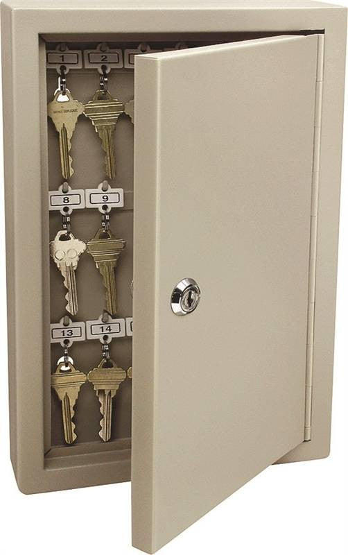 Steel key cabinet with keyed cam lock and two keys. Includes numbered key tag with key rings and lock location chart for easy reference. 16 gauge steel construction. More depth for larger key rings. Keys can hang directly on hooks. Holds 30 keys. Size: 12.04"H x 8.11"W x 3.19"D.
