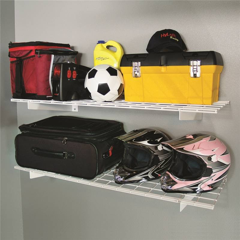 Low-profile brackets increase storage area. Installs on finished or unfinished walls. Installs side by side or stacked. Stores up to 200 lbs. per shelf. Includes: Two shelves and four brackets. Compatible with the HyLoft Add-On Hooks.