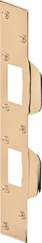 Plated steel strike is supplied with 3" long wood screws to allow additional security, by fastening thru jamb into 2 x 4 outer door framing. 1-5/8" W x 11"H. Spacing between deadbolt opening and latch opening: 3-5/8".