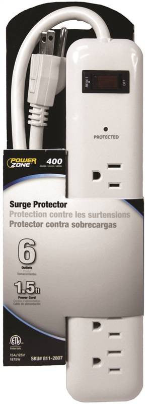 Household use surge protector. Straight plug. Full, 3-line protection against surges through hot, neutral or ground lines, built-in circuit breaker switches to protect against overloads. Superior joule ratings and clamping voltage ratings. Rated 400 joule, 15 amp, 125 volt, 1875 watts. UL listed. Carded.
