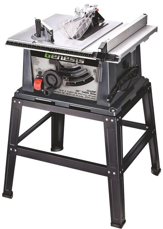 15 amp motor. 4800 rpm. Extra large 24" x 20" die-cast aluminum table. Self-aligning rip fence automatically locks front and rear. Rips material up to 9-1/2" wide. Tool-free installation of blade guard and anti-kickback pawls. Oversized sliding miter gauge for miter cuts from 0-45 degrees. Bevel cut from 0-45 degrees. Rocker on/off switch. Optional sliding extension table expands rip capacity to 24". Includes: 40T Carbide-Tipped blade and heavy duty metal stand. Weighs 55 lbs.