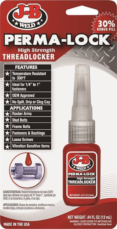 Use to seal the threads against leakage and prevent rust and corrosion. Can be used on 1/4" to 1" fasteners. High strength for heavy-duty applications. Suited for permanently locking studs. Locks against vibration loosening. Temperature resistant to 300-degrees Fahrenheit. OEM Approved.
