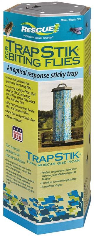Catches flies that feed on blood, such as horse flies, stable flies, black flies and deer flies. It also catches common filth and nuisance flies. Uses new VisiLure technology to lure biting flies with appealing colors and a multi-dimensional pattern. Biting flies are attracted by the colors and patterns, then get stuck to the adhesive surface. Flies blend in to the pattern once they're caught. Odor-free, pesticide-free, water-resistant and holds up in hot weather.