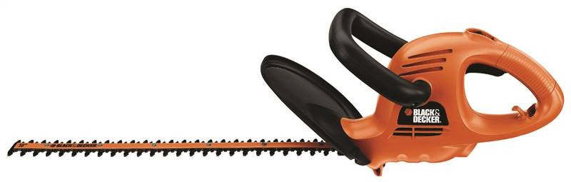 Trims hedges, bushes, and shrubs. Dual action blades cuts branches faster and easier with 40-percent less vibration. 18" Blade for extended reach and even cutting. 3-Sided comfort handle provides larger gripping area for increased comfort and control. Lock-on switch for continuous running. Lock-off switch prevents accidental start-up. Cord retention prevents trimmer from coming unplugged. Pre-hardened, rust resistant steel blades stay sharp longer. SPECIFICATIONS: 3 Amp motor, 3400 SPM, 18" blade length, up to 5/8" max cutting capacity, 5.48 lbs. tool weight.