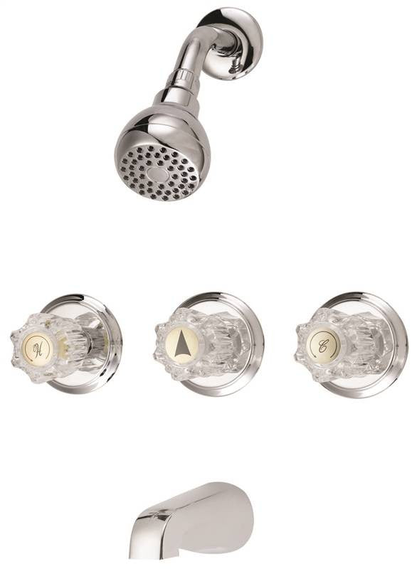 Acrylic round handle, durable metal construction, solid brass waterway, washerless cartridge, zinc tub spout, IAMPO certified, max 2.0 Gpm at 80 psi, single setting showerhead