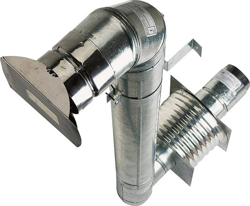 For pellet and corn appliances. Kit contains: 3" horizontal cap, 3" 90 degree elbow, 3" wall bracket, (5) 3" one-foot pipe lengths, 3" tee with cleanout, 3" wall thimble, and 3" pipe connector. System rated for flue temperatures up to 570 degrees. Proven coupling joint connects in seconds to assure joint integrity. Gasketed joint design. Inner wall is 304 stainless steel, outer wall is paintable galvanized. Rolled-over male end eliminates sharp edges. 1" clearance to combustibles. Removable tee cap for inspection and cleaning. Internal spacing bead assures uniform insulating air space between pipe walls. Meets UL-641 and UL-103.