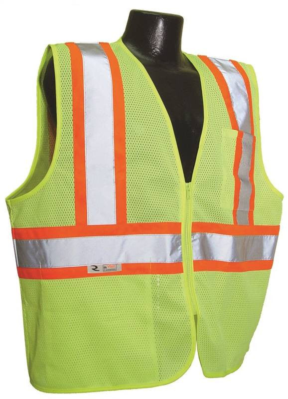 Closure: Zipper; 2" silver tape reflective material. 1 horizontal stripe; contrasting trim detail; Pockets: 1 upper left front; 1 lower right inside; Material: 100% polyester mesh; 3rd party certified - meets ANSI/ISEA 107-2010 standards.