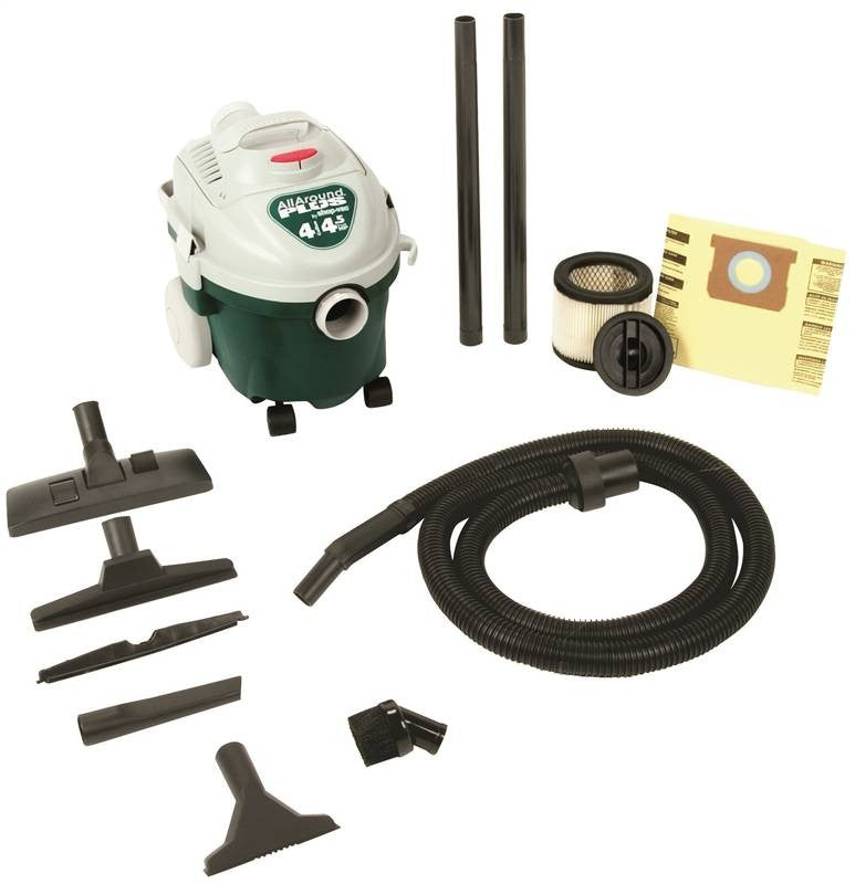 Lightweight, compact, space-saver design adaptable to interior/exterior chores for carpets, boats, vehicles, campers/RVS, upholstery, stairs, kitchen or shop. Quiet 9-amp motor. Auto suction shut-off prevents overflow. Plastic tank resists rust and dents. Easy-to-use disposable collection bags. Easy reach on/off switch, convenient top carrying handle and 2 large rear wheels for easy glide movement. 18' cord length. Includes a cartridge filter and disposable, high efficiency filter bag. 8' x 1-1/4" LockOn hose, (2) 1-1/4" extension wands, dual service selector nozzle, wet/dry nozzle, crevice tool, a round brush, cartridge filter and filter bag.