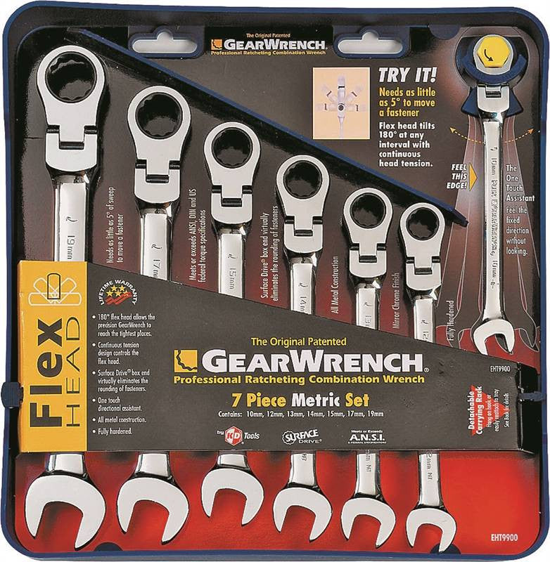 Flex heads provides greater access in tight spaces. Set of full polish, fine-toothed combination ratcheting wrenches with Surface Drive Plus Technology. Combines the speed of a ratchet and the access capabilities of a wrench. Includes: 10, 1, 14, 15, 17, and 19mm.