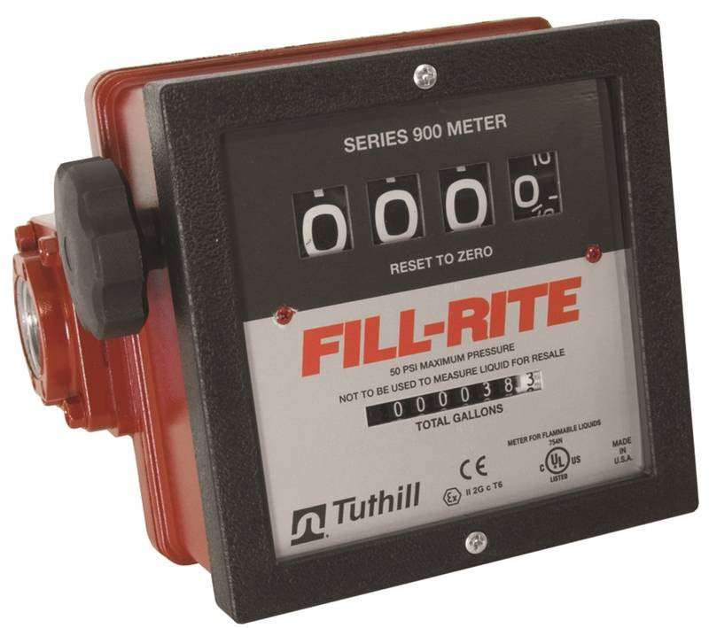 Flow rate of 6 to 40 GPM. Accurate to within +/- 2-percent. 1" inlet and outlet flow ports positioned vertically or horizontally. 50 PSI max pressure. Rated for gasoline, diesel, kerosene, mineral spirits, solvents and heptane. Weatherproof, corrosion resistant. Aluminum housing, Viton and Buna seals. UL/cUL, CE, Ex.