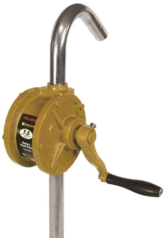 Designed to use with barrels or tanks for all types of petroleum products; SAE30 motor oil max viscosity. Fluid transfer made smooth and easy. Siphon effect achieved by attaching hose to outlet spout. Cast iron construction. Included suction pipe adjusts for 15 to 55 gallons drums. -15 to 150 degrees Fahrenheit min to max ambient operating temp. 7.5 gallons of fluid per 100 revolutions. 1" NPT inlet, 2" NPT bung adapter and suction tube. 1"OD gooseneck discharge spout.