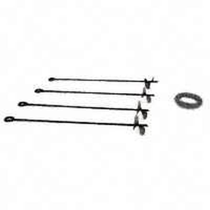 A necessity for wind protection. Provides do-it-yourself protection for any storage building. May be used to anchor fences, tents, trees, boats, carports, antennas, airplanes, pool covers and playground equipment. Includes 30" eye anchors with 4" helix, 4-1/8" galvanized clamps and 60-1/8" galvanized aircraft cable. Boxed.