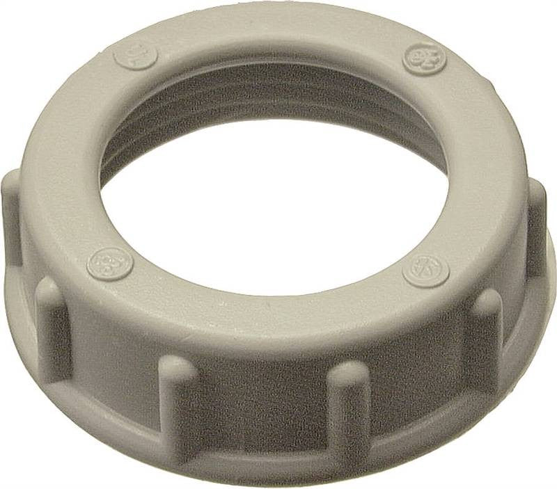 High impact thermoplastic. Flame retardant to 105 degrees C. Use with locknut to terminate threaded Rigid or IMC conduit to an outlet box. The rounded surface of the bushing prevents damage to wire insulation. Required by the NEC. UL Listed, CSA Approved.