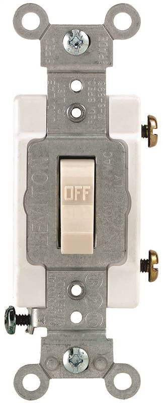 Commercial spec grade toggle switch, 15 amp, 120/277 volt, single-pole AC quiet switch, grounding, side wired. UL Listed, CSA Certified